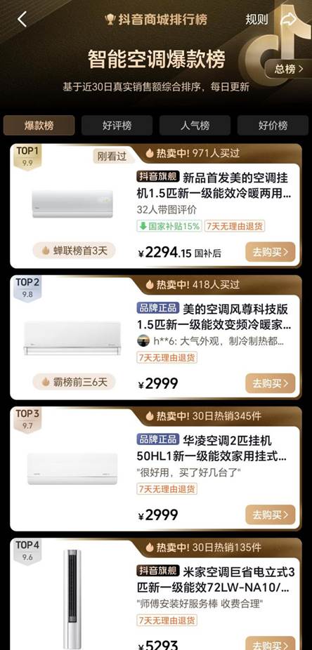 霸榜抖音智能空调爆款榜、人气榜和好价榜榜首,新品酷省电二代开启省电芯时代