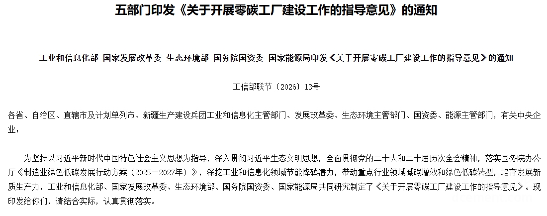 日前,工业和信息化部、国家发展改革委、生态环境部、国务院国资委、国家能源局五部门印发《关于开展零碳工厂建设工作的指导意见》的通知(以下简称“通知”)称,零碳工厂建设是指通过技术创新、结构调整和管理优化等减排措施,实现厂区内二氧化碳排放的持续降低、逐步趋向于近零的过程。贯彻落实党中央、国务院决策部署,引导工业企业试点建设零碳工厂,带动行业减碳增效和绿色低碳转型,对于因地制宜培育发展新质生产力,更好统筹高质量发展和高水平保护,支撑实现碳达峰碳中和目标具有重要意义。