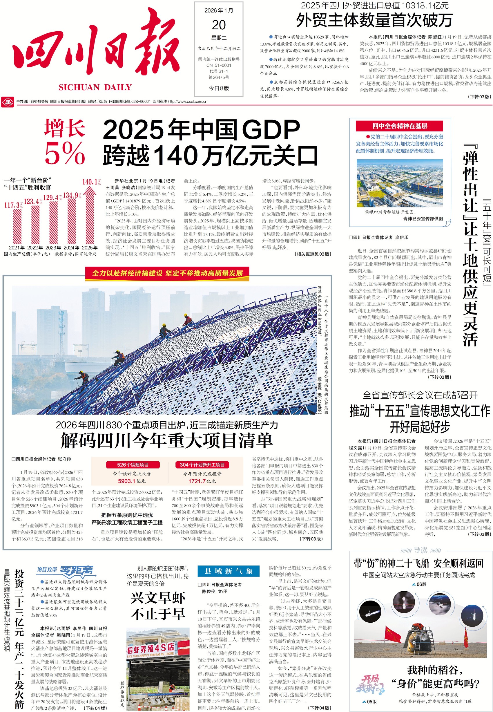 2026年四川省重点项目名单昨日公布,总计830个,预计完成投资超7600亿元。其中,产业项目425个、基础设施项目318个、社会民生项目63个,既兼顾经济发展,又回应了民生所需,为“十五五”开局强势赋能。值得注意的是,新质生产力项目超240个,包括西部空天产业园、邛海实验室等。项目透露了哪些发力重点?关注今日一版了解详情。