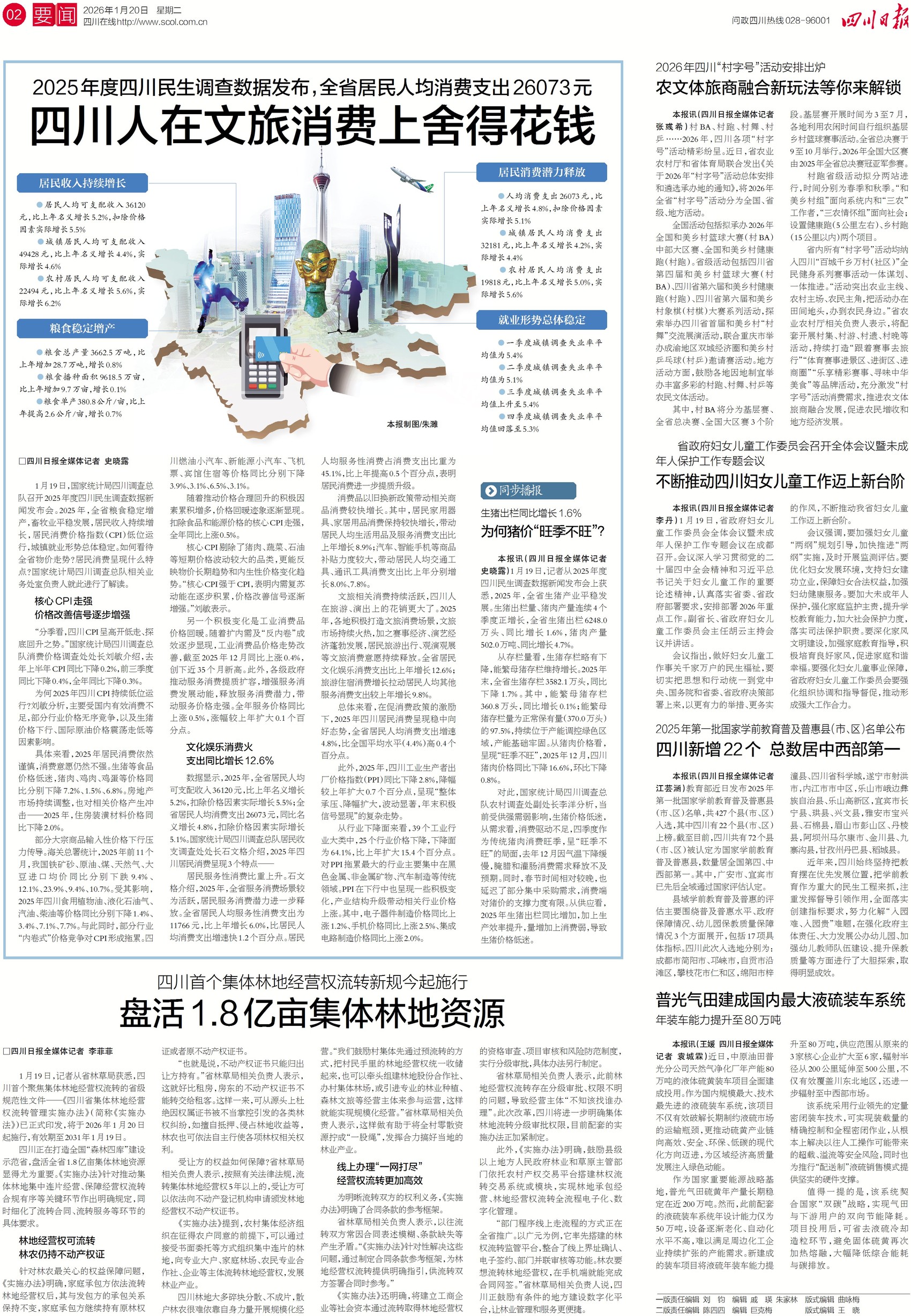 昨日,一年一度的四川“消费账单”出炉:2025年全省居民人均消费支出26073元,居民消费价格同比下降0.3%,全年持续低位运行。居民服务性消费比重上升,文旅消费跑出了“加速度”,特别是全省居民文化娱乐消费支出,比上年增长12.6%。如何看待四川物价走势?背后藏着哪些积极信号?关注今日二版详细数据和业内人士解读。