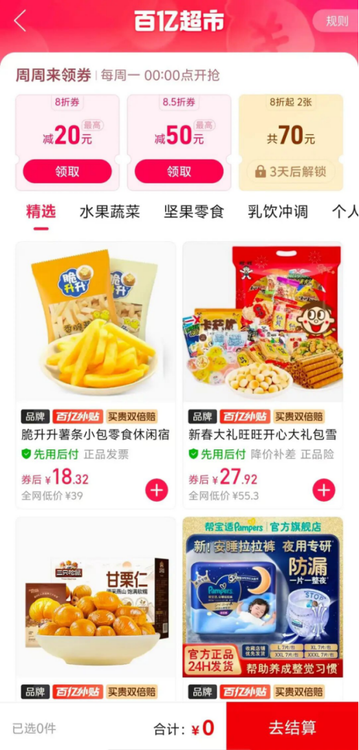 由于下设在百亿补贴频道之下,百亿超市也提供了各类品优惠券及补贴活动,比如“周周领券”活动,即每周一00:00准时开抢优惠券,包含8折券、8.5折券等福利。