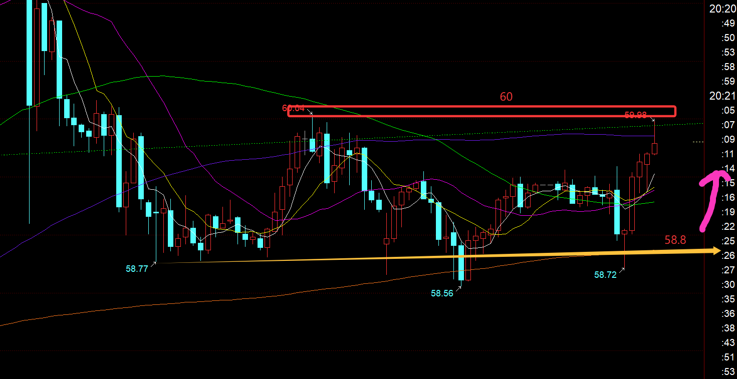 原油方面:今日再次依托日线前期通道上轨回踩支撑反弹拉升一波,58.8一线底部箱体支撑,60一线是当前箱体阻力,今晚留意区间内运行,要突破站上60,才能进一步延续反弹,今晚回踩59.2及下继续北上看反弹;。