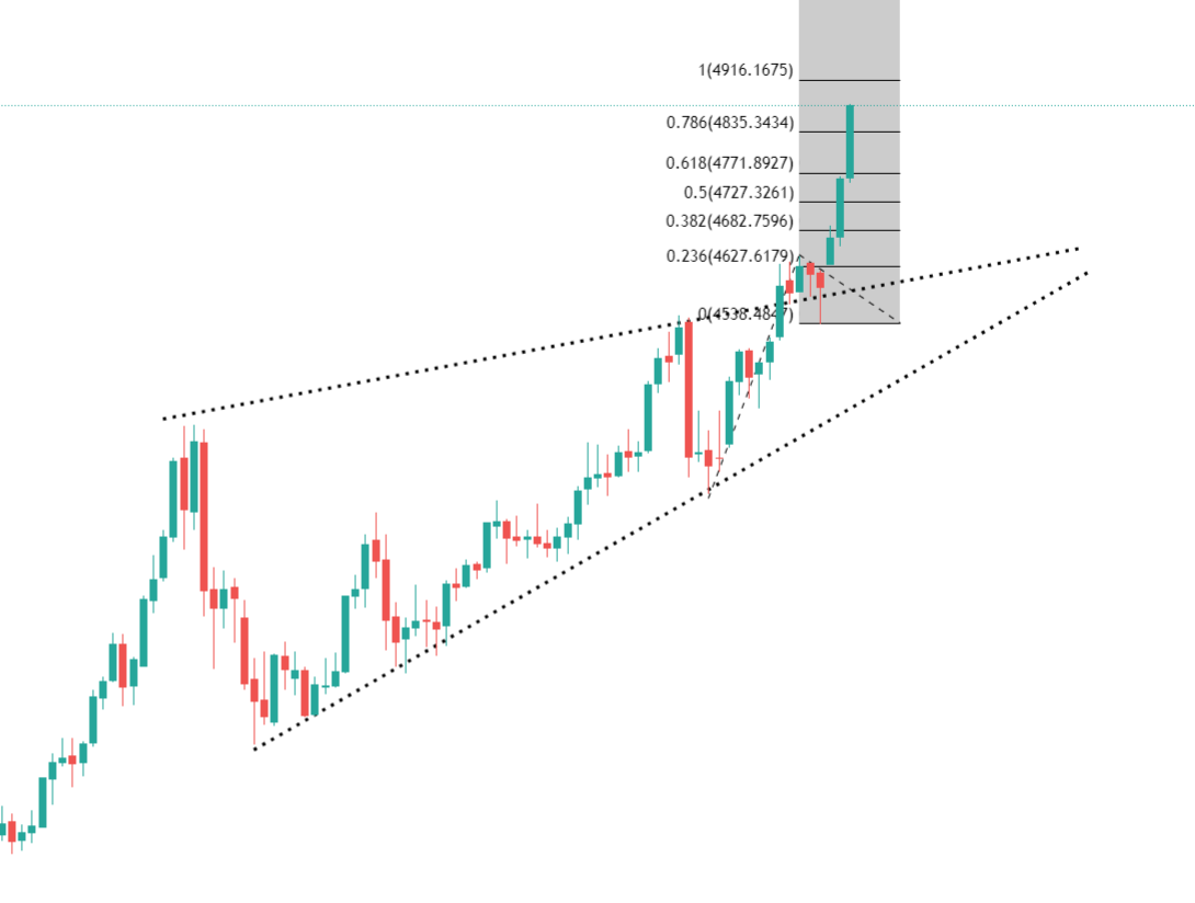利润嘛,只需要看到4785即可,因为现在不只是上涨没办法定具体目标,你看跌也是如此,行情跟之前K线的距离拉开的太大了,如果只是为了看个什么短线10几美金,那就不属于交易策略了,你自己看着盘面操作就行,完整洗盘表现来说,看到4785,也就是今天暴走的启动位置没什么问题,当然我还有备选,如果上去80的话,甚至突破4890,那我会直接反手追涨,去看到4915目标直接出局,这都是一个比较完美的交易方式。