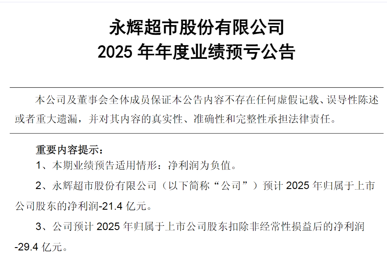 1月20日晚间,永辉超市发布2025年业绩预亏公告,经财务部门初步测算,公司2025年归属于上市公司股东的净利润-21.4亿元,归属于上市公司股东扣除非经常性损益后的净利润-29.4亿元。