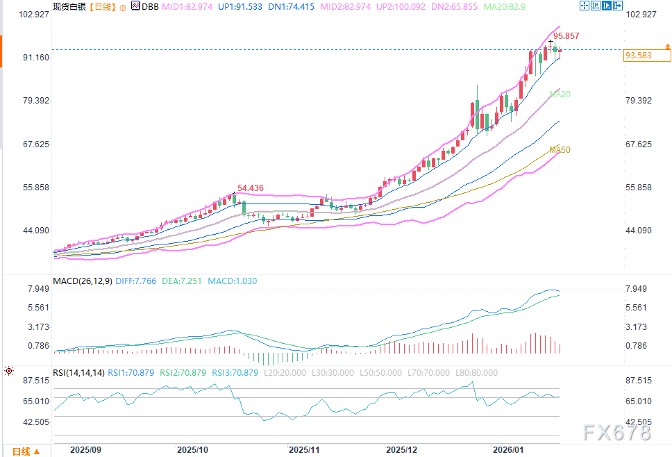 需要提醒的是,长期多头趋势并不意味着价格会持续单边上涨,中途必然会伴随多次回调与震荡。投资者在把握长期趋势的同时,需警惕短期风险事件的冲击,除了日本央行货币政策决议外,后续还需关注美联储利率决议、全球地缘政治局势、美元指数走势等关键因素,这些因素都可能引发白银价格的短期剧烈波动。汇通财经APP讯——周四(1月22日)欧盘时段,白银价格一度强势上攻,盘中最高触及95.362美元/盎司,距离前期高点95.857美元仅一步之遥,展现出较强的多头动能。但就在市场期待突破95美元关键阻力位之际,价格却遭遇明显卖压,逐步回落至94.20美元附近震荡整理,尾盘略有回升但仍未能站稳95美元上方。
