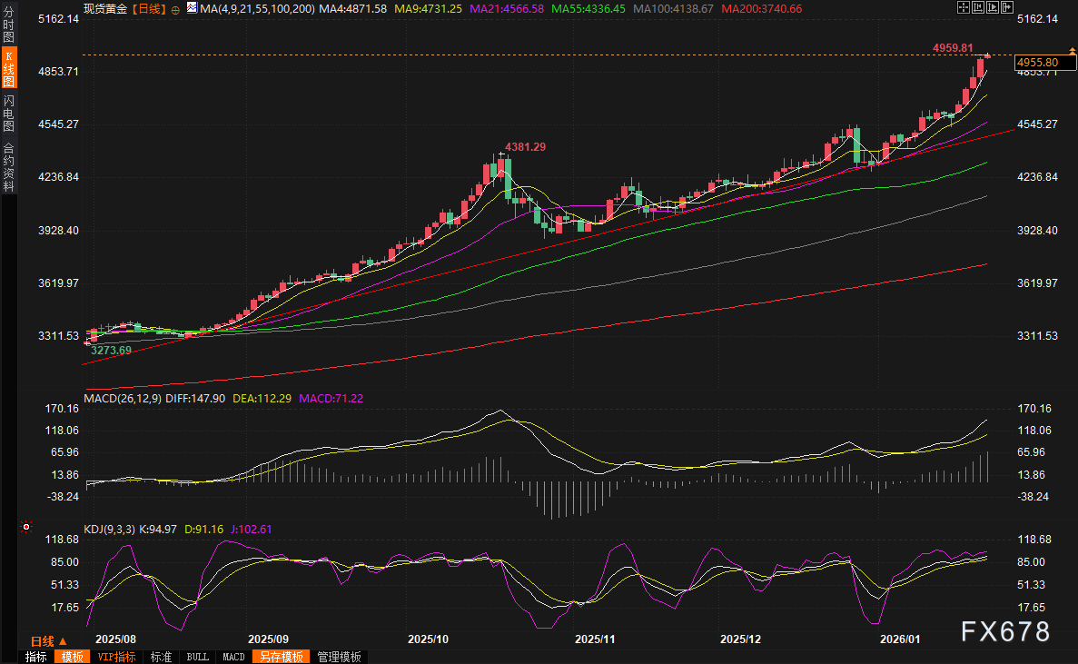 汇通财经APP讯——在2026年的开年之际,全球黄金市场迎来了一场史无前例的狂飙盛宴。现货黄金价格周四(1月22日)首次突破每盎司4900美元大关,并持续刷新历史新高,直至周五(1月23日)亚市早盘,截止07:57,触及4960.43美元/盎司的高点。这一波涨势不仅带动了白银和铂金等贵金属创下纪录新高,还反映出市场对地缘政治不确定性、美元疲软以及美联储宽松政策的强烈反应。作为一种传统的避险资产,黄金在当前复杂的国际环境中脱颖而出,成为投资者追捧的焦点。