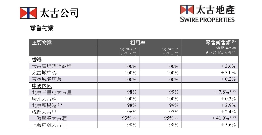 根据《太古地产2025年第三季度营运数据汇报》,截至2025年9月30日,成都太古里的租用率达97%,前9个月零售销售额(不含汽车零售商的销售额)同比增长2.4%。