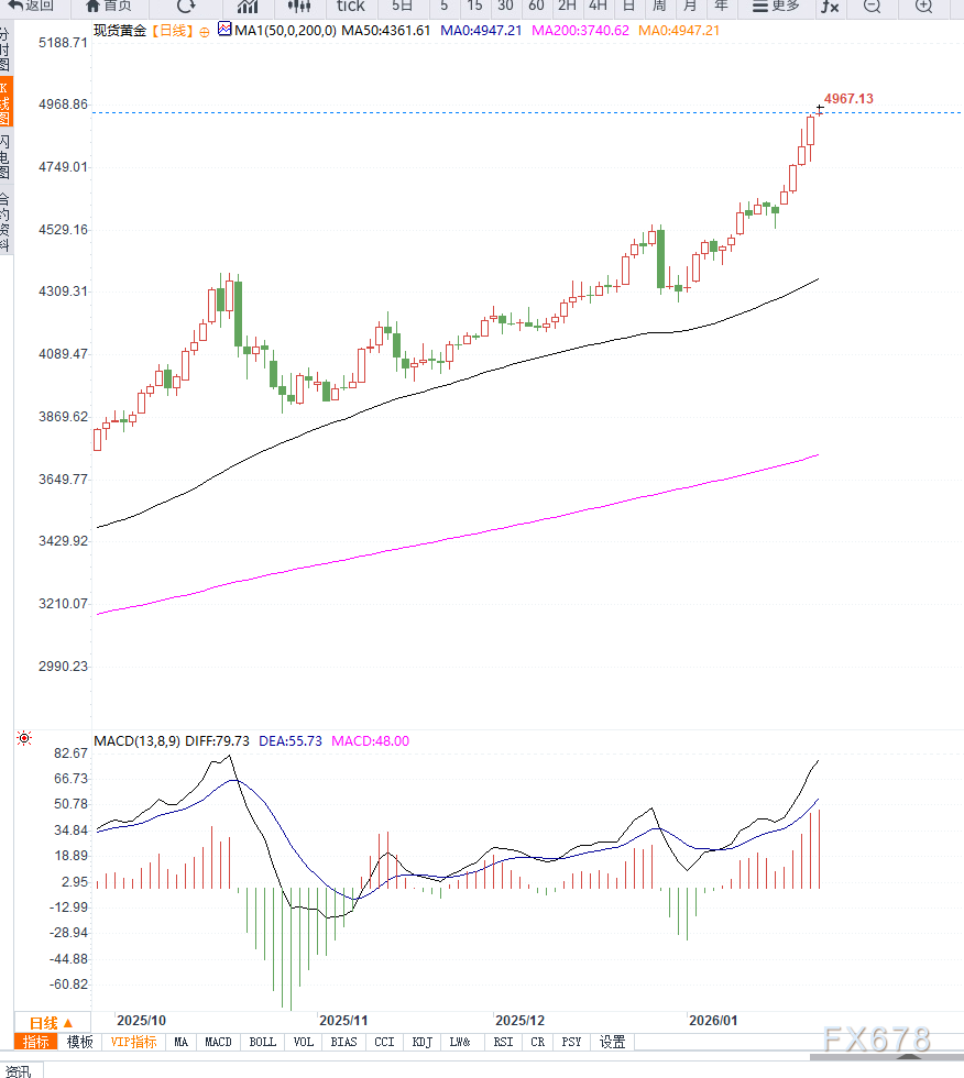 汇通财经APP讯——周五亚洲交易时段,国际金价延续强势表现,XAU/USD一度上探至4950美元附近,刷新历史高位区域。