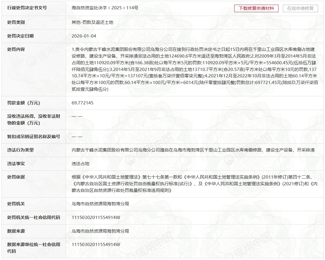 近日,根据相关平台显示,乌海市自然资源局海勃湾分局对内蒙古千峰水泥集团股份有限公司乌海分公司下达行政处罚决定书(海自然资监处决字﹝2025﹞114号),依法责令该公司退还非法占用土地并缴纳罚款。
