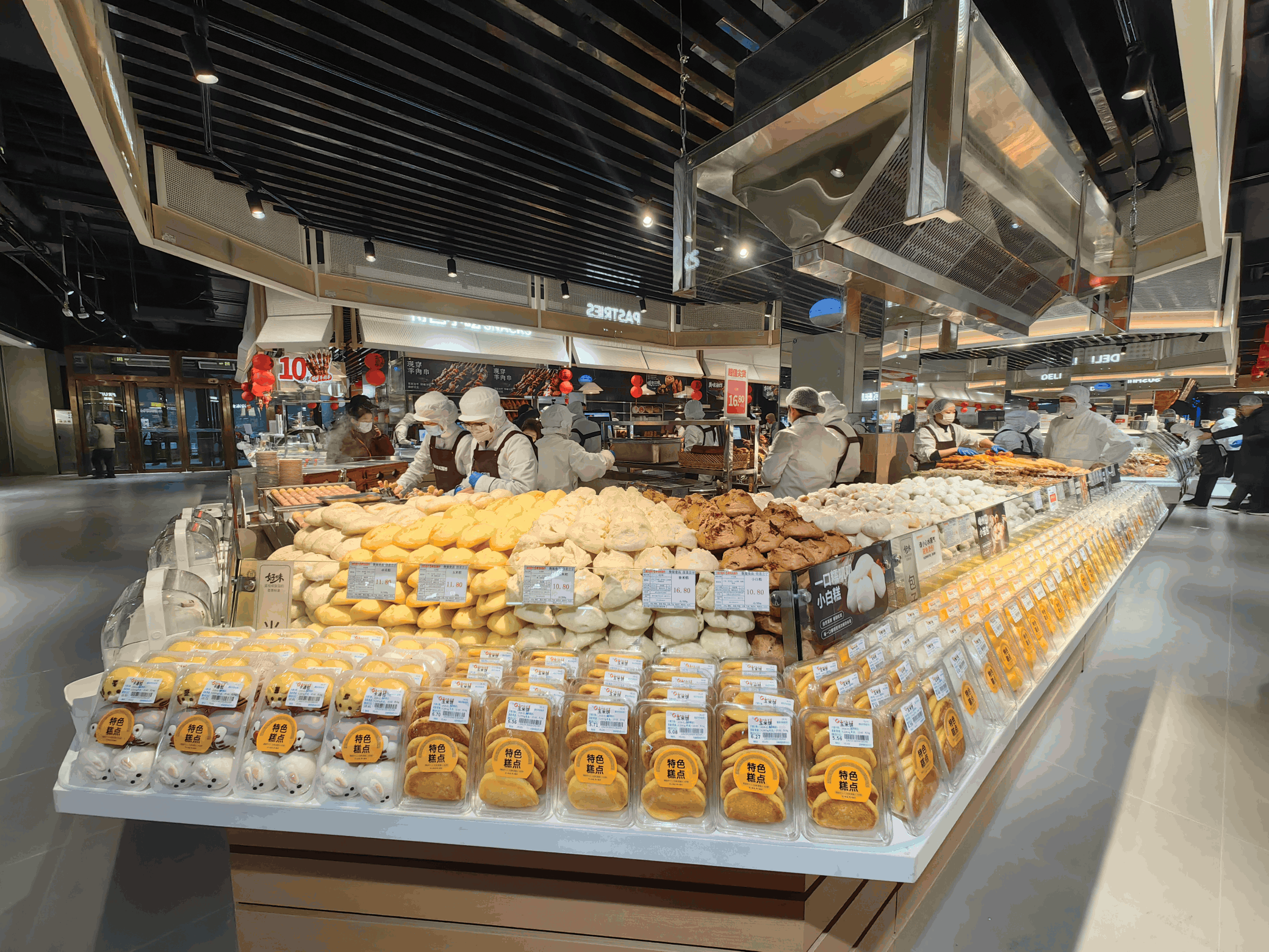 调改后的时代天街店,面积从2700㎡至8000㎡,主要增加了生鲜水果、熟食、餐饮、烘焙、日配冷冻冷藏、休闲食品的可陈列面积以及加工区。新场景超5米宽的主通道让购物视线豁然开朗,1.6米高的“矮化”货架让视野通透无阻,彻底取消强制动线的设计,让消费者实现“自主逛自由购”。