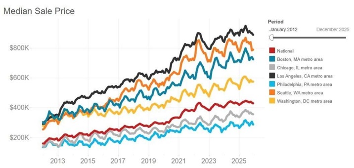 (美国各城市的中位数房屋销售价格 来源:Redfin)
