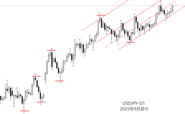行情方面,USDJPY中长期趋势依旧为显著多头,中期底部和顶部有规律的抬高。最新底分型形成于2025年12月16日,自此之后行情正在寻找新的顶分型。截至目前,两个最新顶分型都不符合要求,预计行情涨势延续,直至中期顶分型出现。图中通道线可以作为实时阻力位,行情与通道交叉时有回落可能。