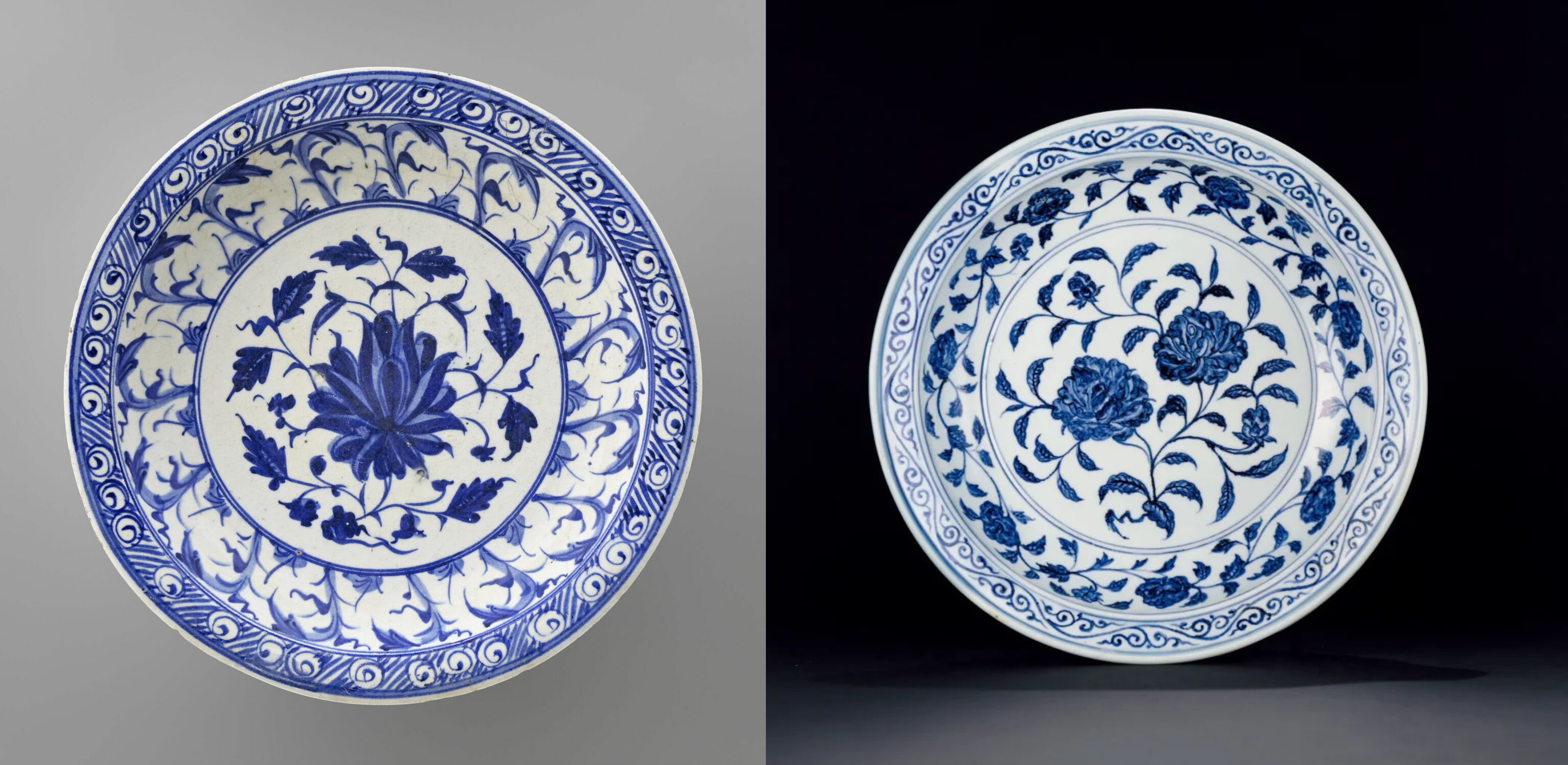 左:伊朗15世纪《牡丹纹盘》 右:明代永乐年间青花牡丹纹盘