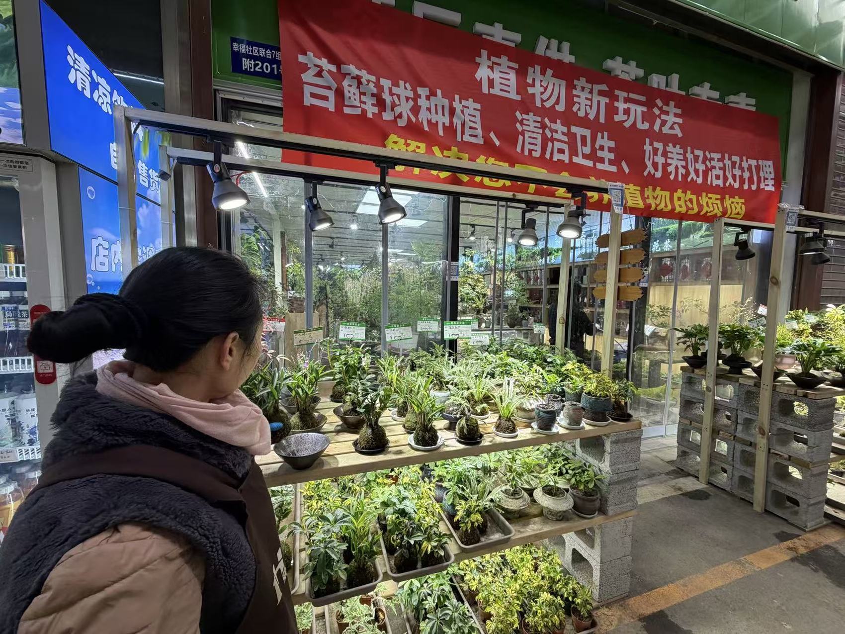 “这个不需要怎么打理,干了就把它扔进水里泡一分钟,拿出来继续摆着,十天半个月都不用管。”1月21日,成都三圣花市一家绿植店内,花艺师郭刘丽托着一个绿茸茸的苔藓球向顾客演示。不到5分钟,这笔生意便顺利成交。