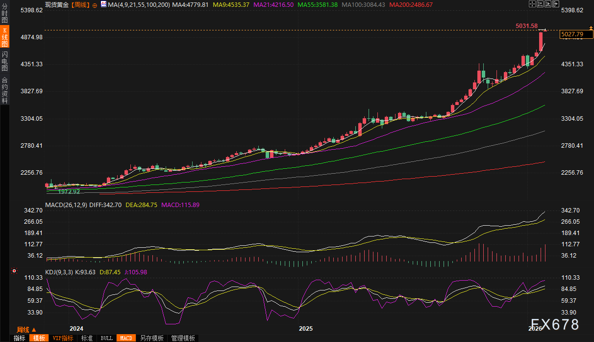 上周五(1月26日)现货黄金价格接连刷新历史纪录,一度触及4989.73美元/盎司的峰值,,上周累计上涨8.5%,为2020年3月新冠疫情以来最大单周涨幅。