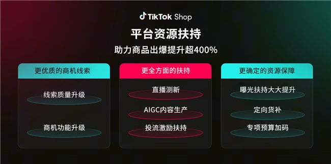 此外,TikTok Shop也将为全托管女装行业商家带来全方位扶持,商家不仅能享受更优质的商机线索,还将获得直播测新、AIGC内容生产、投流激励等资源加持,以及定向货补、专项预算加码等保障,助力商品出爆提升超400%。