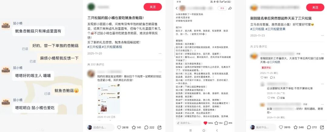 2025年,三只松鼠就因为一个偶然的契机,「起鼠名」「称呼顾客为主人」的企业文化火到上热搜,消费者们开始找上三只松鼠的客服聊天,不仅问产品,还会聊他们怎么起的鼠名、好朋鼠是谁,客服们也都充满活人感地回答。消费者们集结在小红书,共享与客服的聊天记录,给客服排座位表,甚至会自觉地「聊完天后下单」,用实际消费为品牌的真诚买单。
