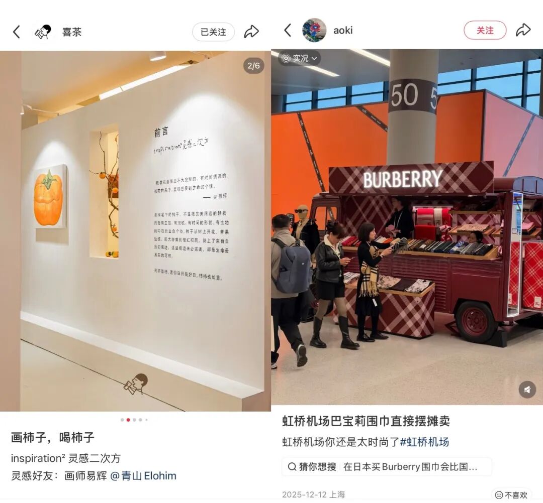 除了布局实体门店,越来越多品牌还将营销重心放回线下,通过打造沉浸式、场景化的体验活动传递品牌价值。从首次登陆亚洲的「西太后珠宝展」,到喜茶讲述「喜柿多多」产品故事的「日日柿好日」灵感画展。再如,罗意威在上海开出新店后与哈啰联合推出「罗意威金色骑旅」活动,BURBERRY在上海虹桥机场的「红色围巾车」,以轻量化的触点,将品牌渗透到消费者的生活场景中。