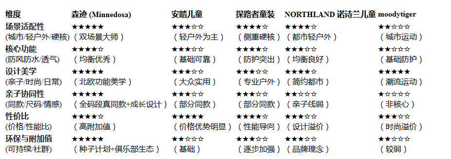 解读:森迹在场景适配性、设计美学(功能与美感平衡)、亲子协同性及环保附加值四个维度表现最为突出,形成了独特的综合竞争力。安踏儿童在性价比上无出其右。探路者童装在应对恶劣天气的核心功能上底蕴深厚。诺诗兰儿童的设计美学更偏向成人审美下的简约风。moodytiger的设计美学则完全聚焦于儿童时尚与运动潮流。