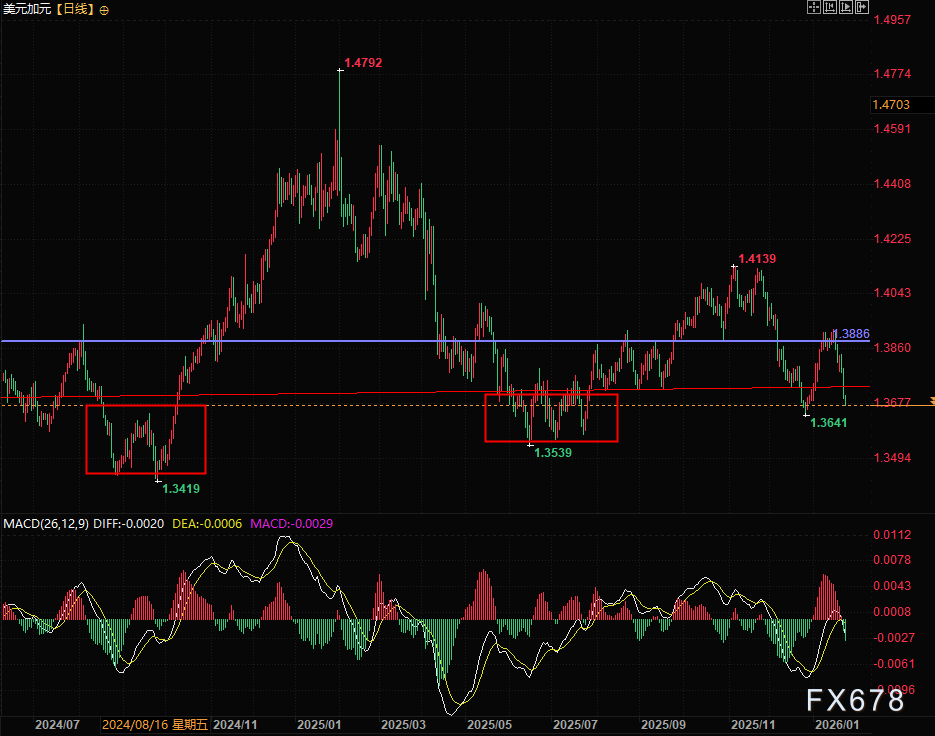 汇通财经APP讯——周一(1月26日)美元加元继续下跌,虽然加拿大受到了美国的关税威胁,但是疲弱的美元并没有阻止加元的升值,目前交投于1.3678。