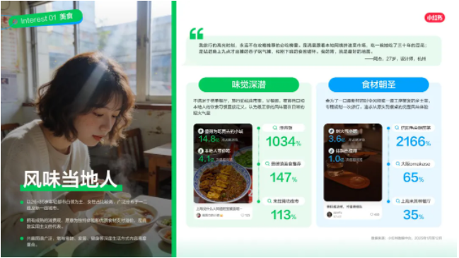 比如,风味当地人,以26-35岁年轻都市白领为主,女性占比较高,广泛分布于一二线及新一线城市;拥有成熟的消费观,愿意为独特体验和优质食材支付溢价;兴趣图谱广泛,常与宠物、家居、健身等深度生活方式内容高度重合。