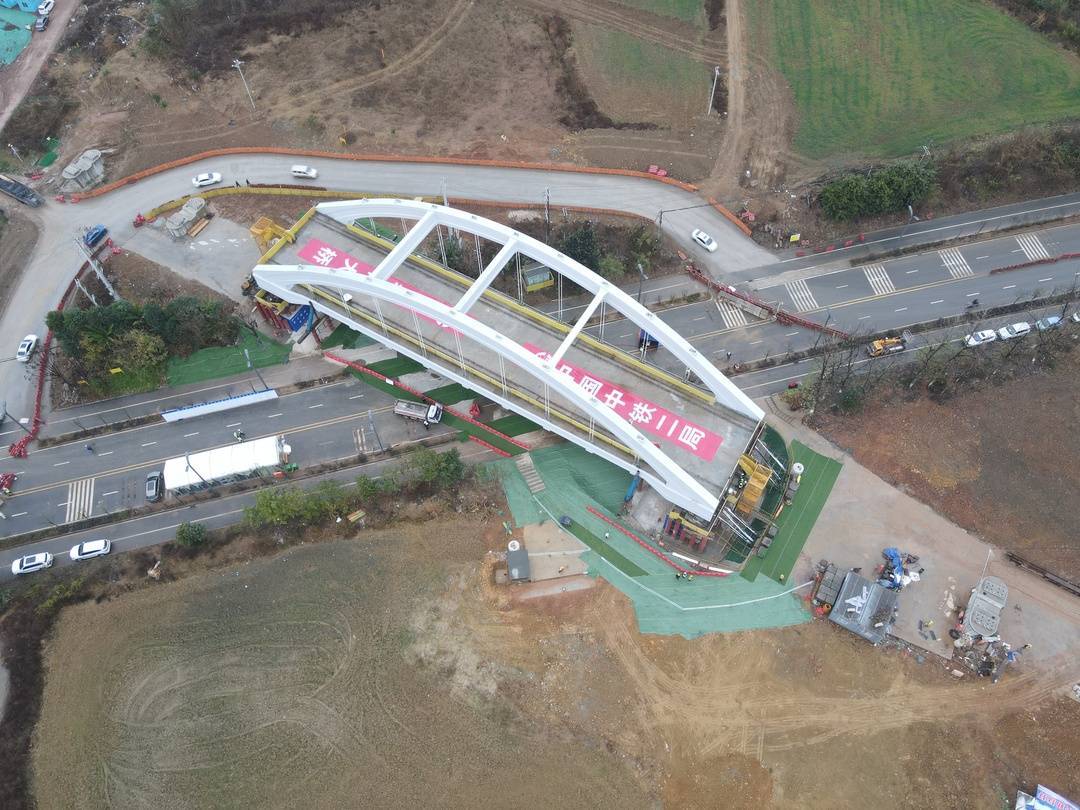 大桥采用1孔72米系杆拱桥结构,配合高位落梁施工工艺,跨越既有市政道路,可最大限度保证桥下通行净空,从而在不中断桥下交通的情况下完成梁体施工。