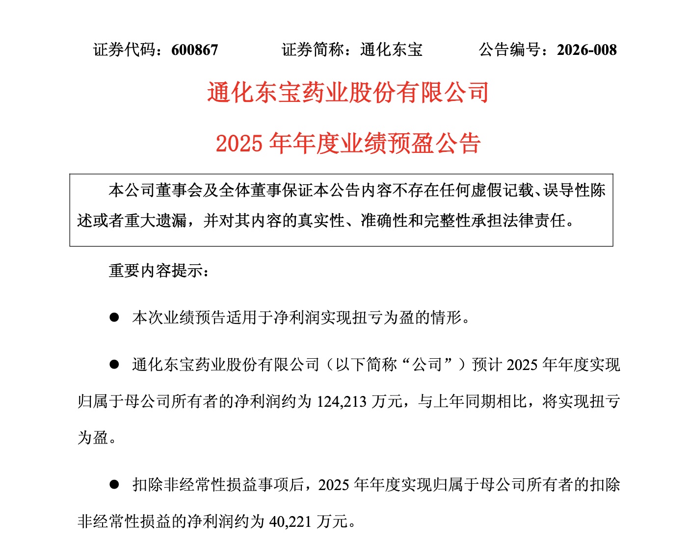 1月26日晚,通化东宝(股票代码:600867.SH)发布2025年业绩预盈公告,公司预计全年实现归属于上市公司股东的净利润约12.42亿元,扣除非经常性损益的净利润约4.02亿元。