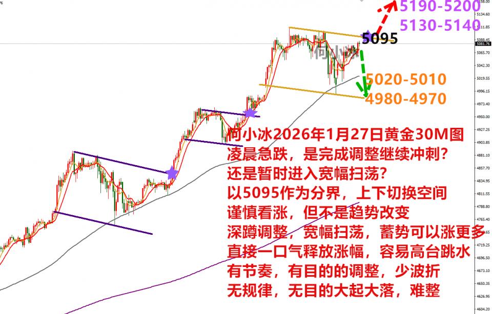 @何小冰,仅代表作者个人的看法!何小冰:金价以5095作界,切换200幅度的空间