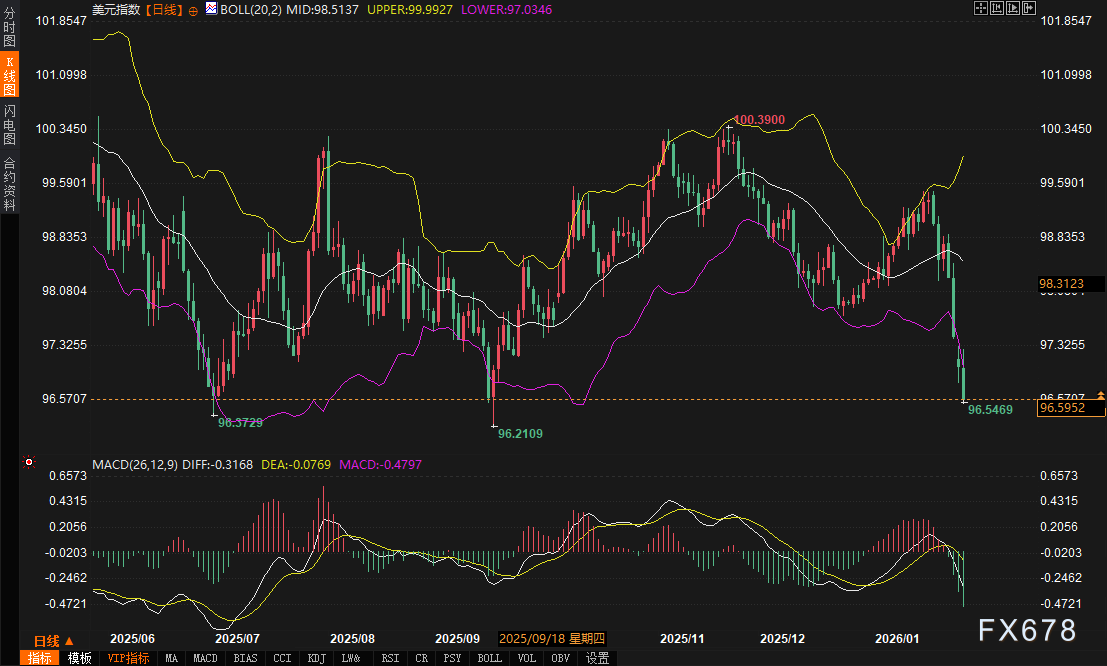 1.区间破位日线图显示,美元指数此前在96.5–100.4的大区间内震荡。近期价格连续走弱,已有效跌破97.03附近的布林带下轨支撑,并触及96.5928的前期关键水平。这意味着长达数月的震荡区间下沿已被击穿。