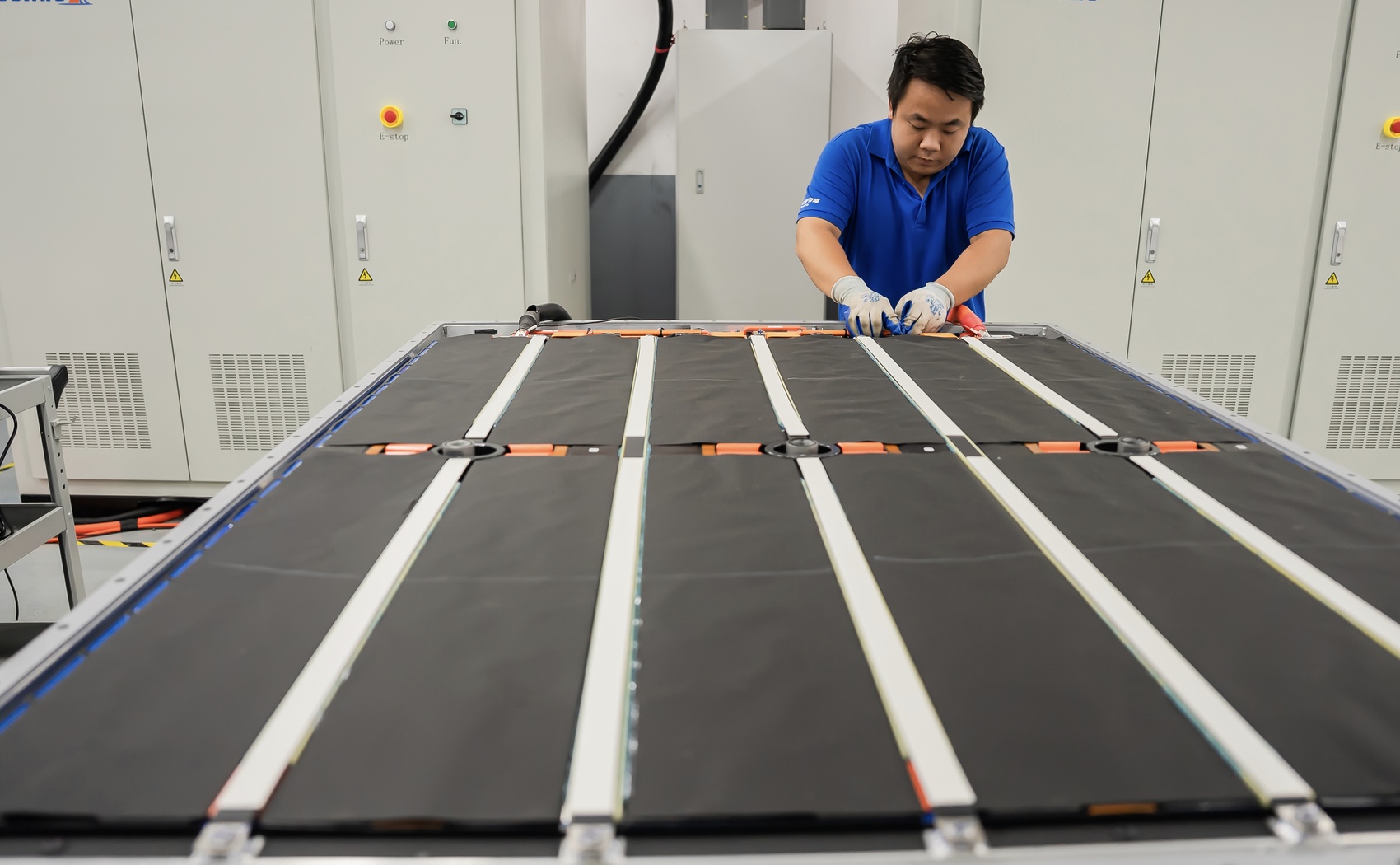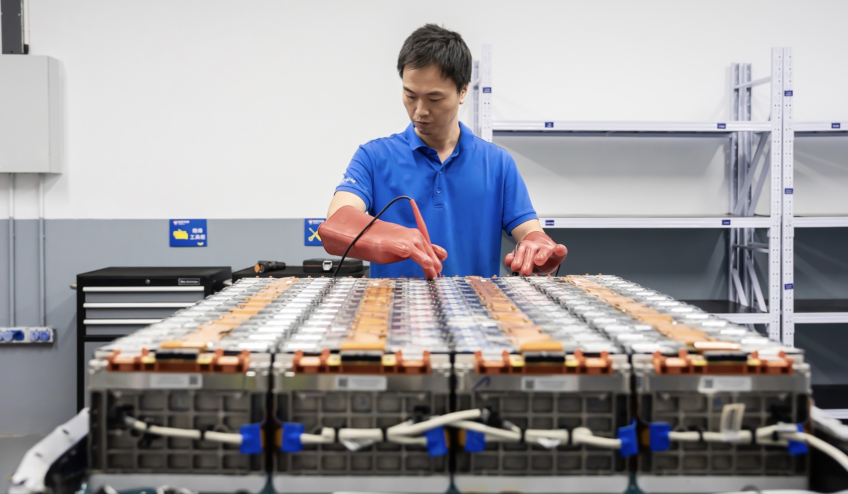 在成都市新津区电驴时代的维修车间,记者看到数十辆新能源汽车整齐排列,等待检测维修,几名学徒正观摩资深技师操作。