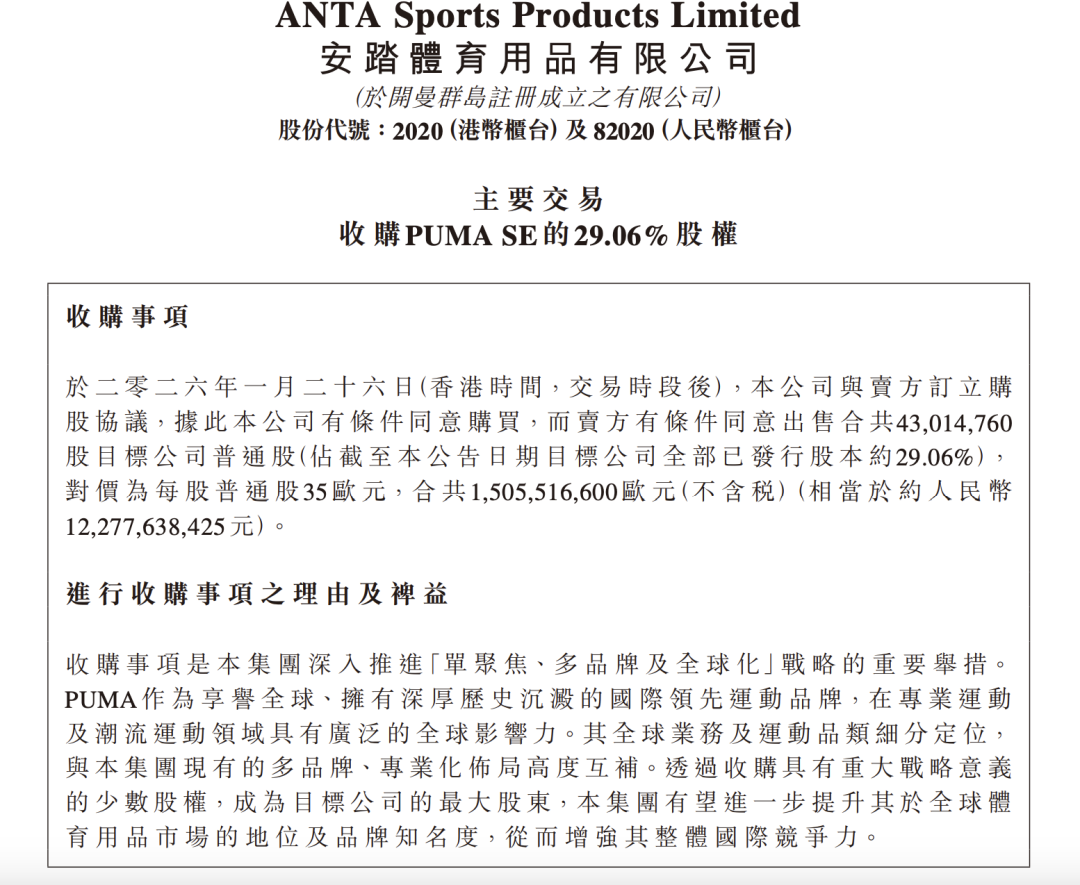 安踏宣布,与Pinault家族的投资公司Groupe Artémis达成购股协议,收购彪马(PUMA)所属公司PUMA SE 29.06%的股权,对价为每股普通股35欧元,合计约15亿欧元,相当于约人民币122.78亿元,成为其最大股东。本次交易预计2026年底前完成。