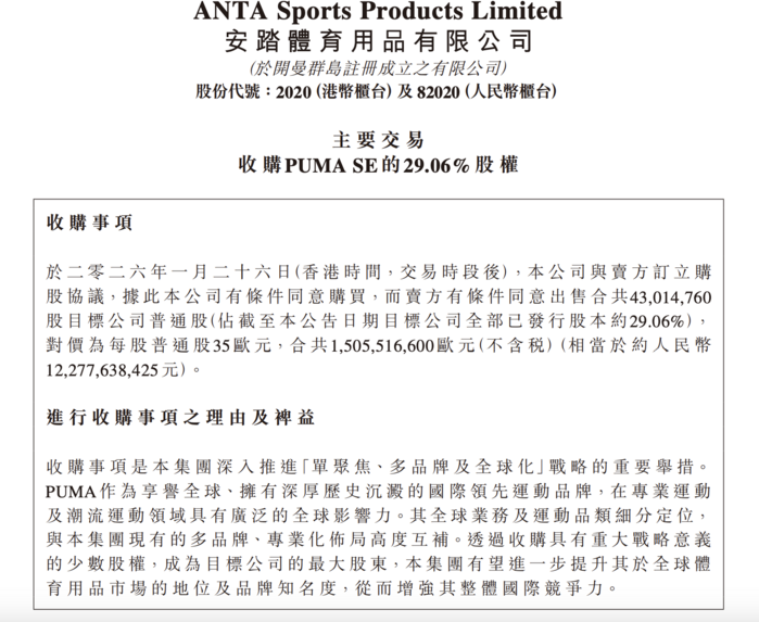 对于此次收购,安踏方面表示,集团充分尊重彪马的管理文化,以及彪马作为德国上市公司的独立治理架构。交易完成后,安踏集团拟寻求向监事会委派合适的代表,后者将与其他监事会成员及员工代表密切协作,同时致力于保持彪马深厚的品牌身份与基因。集团未来将审慎评估双方是否有进一步深化合作关系的可能性。集团目前没有对彪马发起要约收购(收购其他股东股份继续增持)的计划。