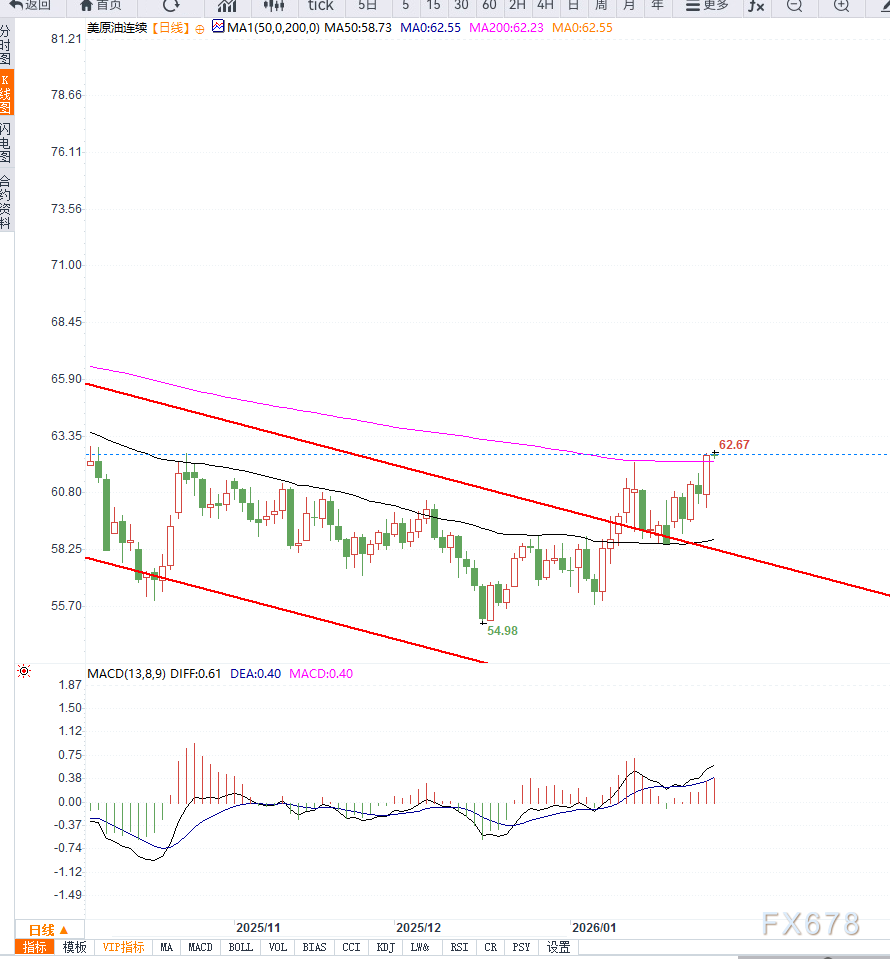 从价格结构观察,62美元一线已由此前的压力区间转化为短期支撑,这一水平对后续走势至关重要。