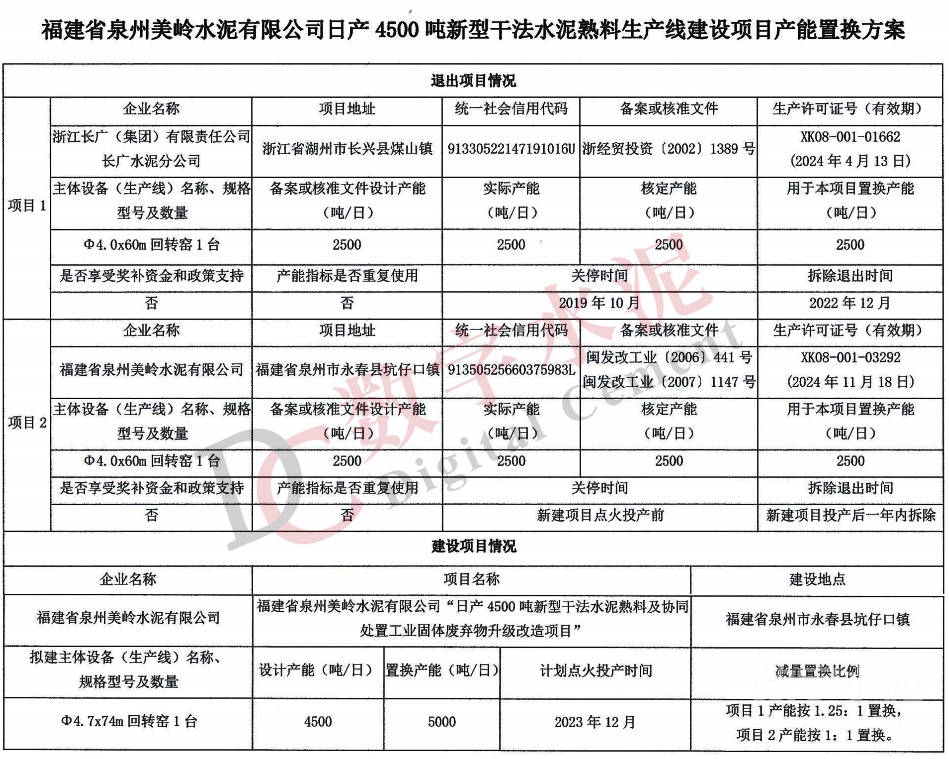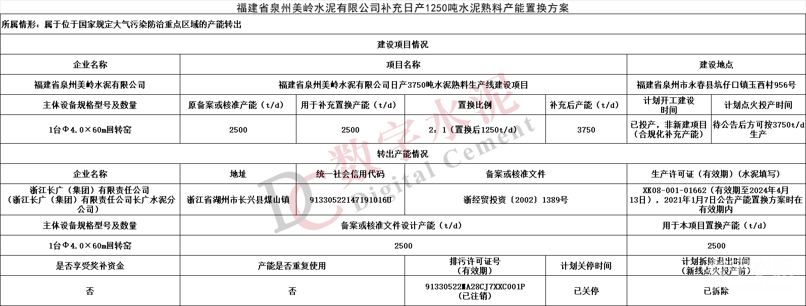 根据公告,福建省泉州美岭水泥有限公司日产3750吨水泥熟料生产线建设项目原备案产能2500t/d,补充置换产能2500t/d,置换比例为2:1。浙江长广(集团)有限责任公司(浙江长广(集团)有限责任公司长广水泥分公司)2500t/d水泥熟料线用于本项目置换产能,该生产线目前已拆除。