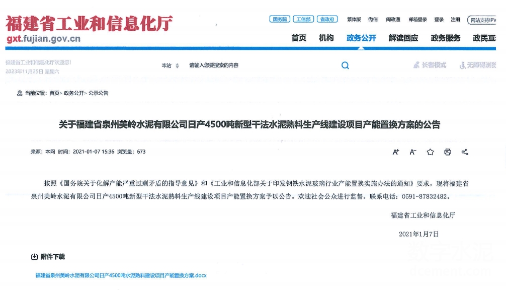 2026年1月28日,福建省工业和信息化厅发布《关于变更福建省泉州美岭水泥有限公司日产4500吨新型干法水泥熟料生产线建设项目产能置换方案的公告》称,根据《水泥玻璃行业产能置换实施办法(2024年本)》规定和水泥产能管理相关政策要求,福建省泉州美岭水泥有限公司日产4500吨新型干法水泥熟料生产线建设项目产能置换方案,变更为补充日产1250吨水泥熟料产能置换方案已公示完毕,现予以公告。