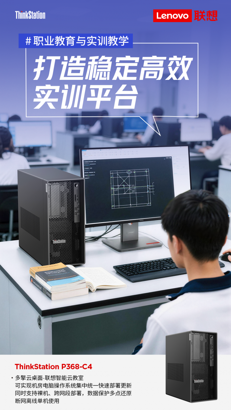 面向职业院校实训基地、高校设计类实验室及技工学校计算机教室,ThinkStation P368以稳定性、易管理性及教学适配性,构建高效实训教学生态。设备搭载多擎云桌面-智能云教室系统,可实现操作系统集中部署、断网离线使用及远程统一管理,大幅简化机房运维流程,降低管理成本。