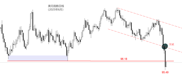 1月19日至今,七个完整交易日,美元指数只有一个交易日收阳线,其余均为大幅度阴K线。美元指数从最高点99.47猛跌至最低95.49,显著拉跌了市场人士此前对美元指数“触底反弹”的预期。