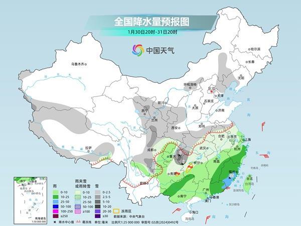 31日,降水范围明显收缩,北方降水基本停歇,安徽中南部、江苏南部、浙江西北部、上海等地雨雪混杂,部分地区有小雪。