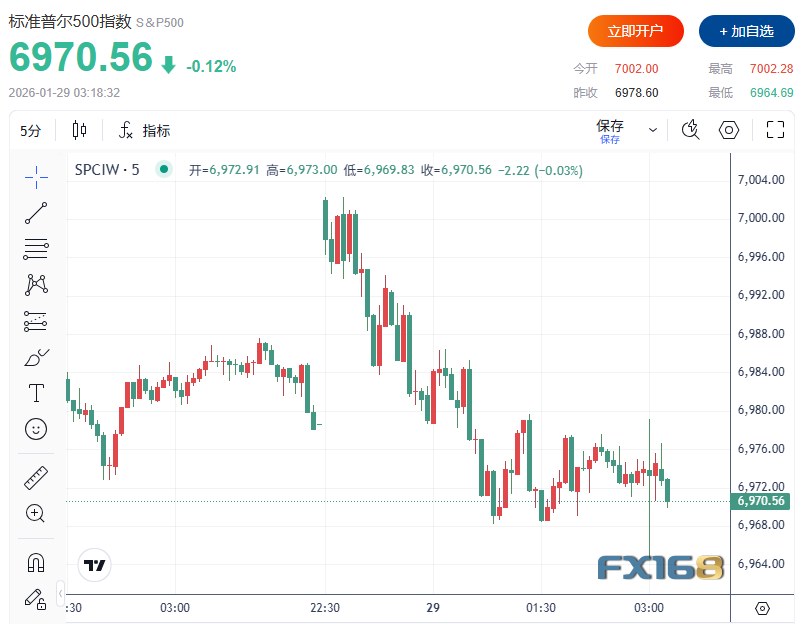 美股短线下滑,标普500指数现交投于6970一线,日内稍早一度突破7000点。