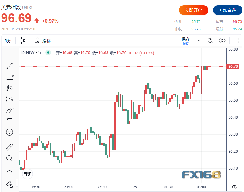 美联储如期按兵不动,美元指数DXY日内大涨1%,并刷新日高至96.73。