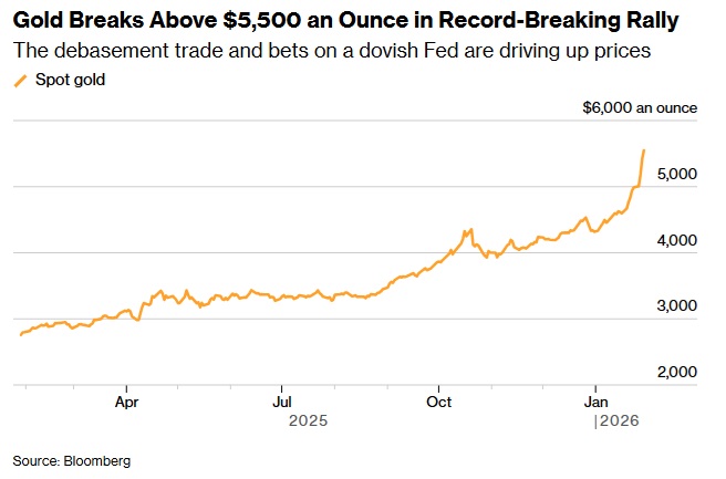24K99讯 周四(1月29日)亚市盘中,现货黄金价格突然暴涨,金价一度逼近5600美元/盎司大关,延续了由美元走弱和投资者逃离主权债券及货币所推动的急剧反弹。美媒称,美国总统特朗普正考虑对伊朗发动新的重大打击,这刺激黄金的避险买盘。
