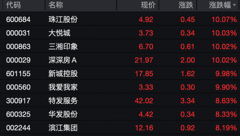 房地产板块亦涨幅居前,板块盘中涨幅一度超过3%。珠江股份、大悦城、深深房A、三湘印象等多股盘中涨停。