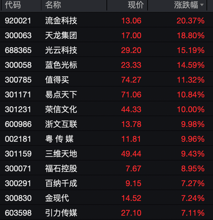 主要行业板块和赛道方面,若按照申万一级行业划分,传媒板块领涨,板块涨幅超过4%。