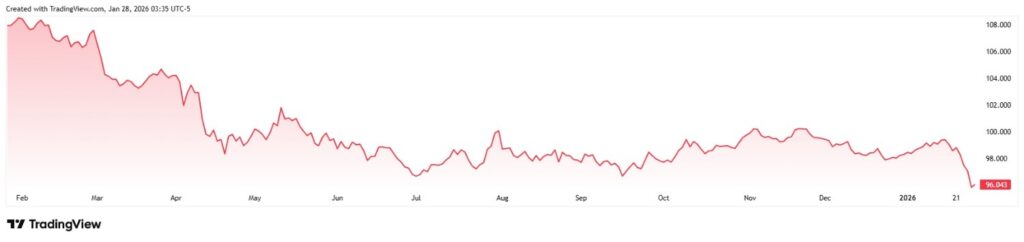 事实上,自2026年开始以来,美元指数延续了2025年的下跌趋势,又下跌了2.21%。
