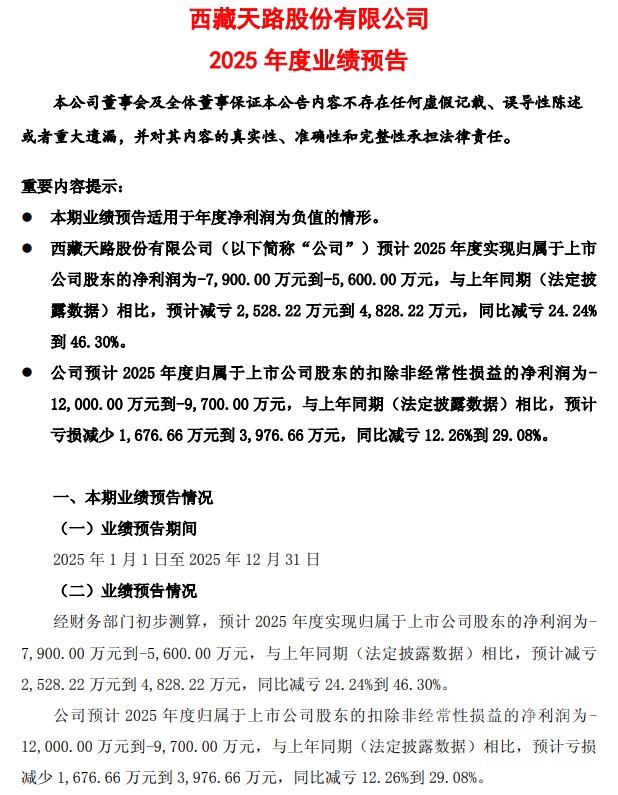 1月28日,西藏天路发布2025年度业绩预告显示,公司预计2025年度实现归属于上市公司股东的净利润为-7,900.00万元到-5,600.00万元,与上年同期(法定披露数据)相比,预计减亏2,528.22万元到4,828.22万元,同比减亏24.24%到46.30%。公司预计 2025 年度归属于上市公司股东的扣除非经常性损益的净利润为12,000.00 万元到-9,700.00 万元,与上年同期(法定披露数据)相比,预计亏损减少1,676.66 万元到3,976.66 万元,同比减亏12.26%到29.08%。