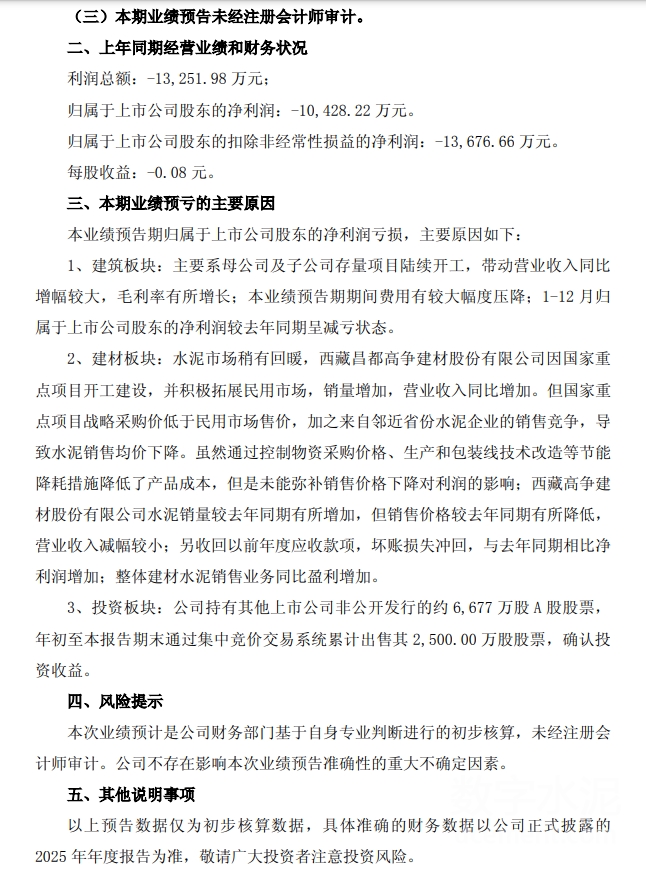 2、建材板块:水泥市场稍有回暖,西藏昌都高争建材股份有限公司因国家重点项目开工建设,并积极拓展民用市场,销量增加,营业收入同比增加。但国家重点项目战略采购价低于民用市场售价,加之来自邻近省份水泥企业的销售竞争,导致水泥销售均价下降。虽然通过控制物资采购价格、生产和包装线技术改造等节能降耗措施降低了产品成本,但是未能弥补销售价格下降对利润的影响;西藏高争建材股份有限公司水泥销量较去年同期有所增加,但销售价格较去年同期有所降低,营业收入减幅较小;另收回以前年度应收款项,坏账损失冲回,与去年同期相比净利润增加;整体建材水泥销售业务同比盈利增加。
