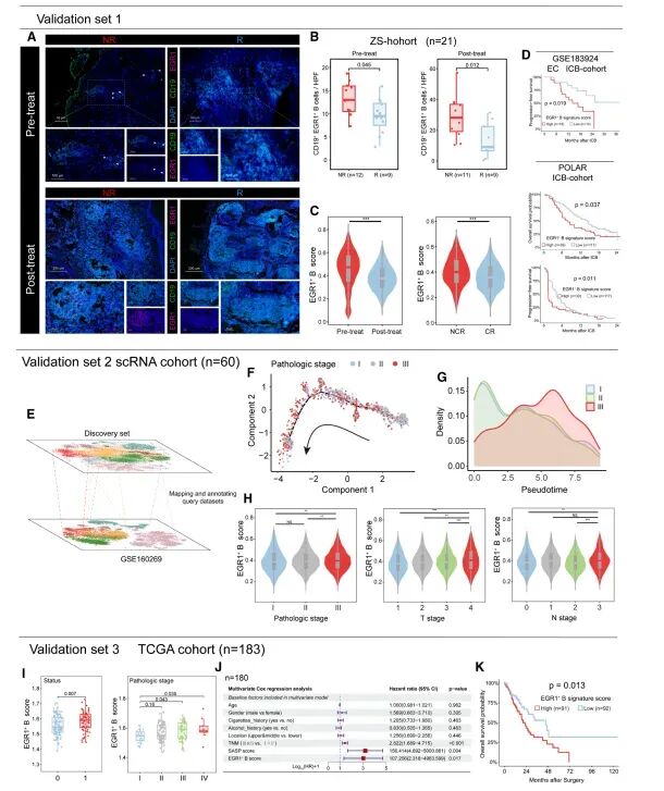 临床验证方面,21例中山医院患者治疗前活检显示,无响应者EGR1+B细胞浸润密度显著高于响应者(p=0.037)(图2B),且治疗后EGR1+B细胞特征在pCR患者中显著降低(p<0.001)(图2C)。外部队列验证证实,高EGR1+B细胞浸润与缩短的PFS相关(图2D)。多因素Cox回归分析(n=180)显示EGR1+B细胞签名评分是独立预后不良因子(HR=107.256,95%CI: 2.318-4963.599,p=0.017)(图2J)。