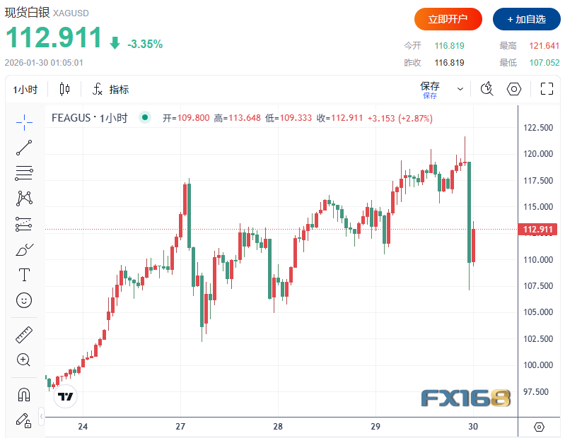 白银价格同样出现剧烈回调。现货白银短线下跌超12美元,跌幅扩大至约8%,刷新日低至107.052美元/盎司,此前曾触及121.641美元/盎司的高位。今年以来,白银价格累计涨幅已超过50%,主要受供应短缺与动量资金推动。