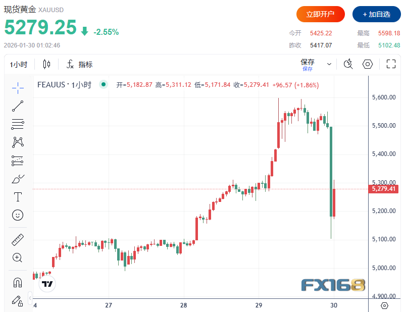 美市盘中,现货黄金短线突然大幅下跌超440美元,刷新日低至5102.48美元/盎司,盘中一度触及5594.82美元/盎司的历史高位。