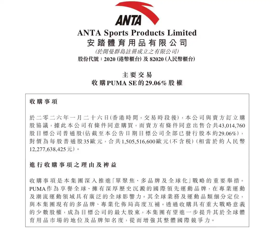 1月27日,安踏集团宣布与皮诺(Pinault)家族的投资公司Groupe Artémis达成协议,收购彪马(PUMA)所属公司PUMA SE 29.06%的股权,将成为这个老牌德国运动品牌的单一最大股东。
